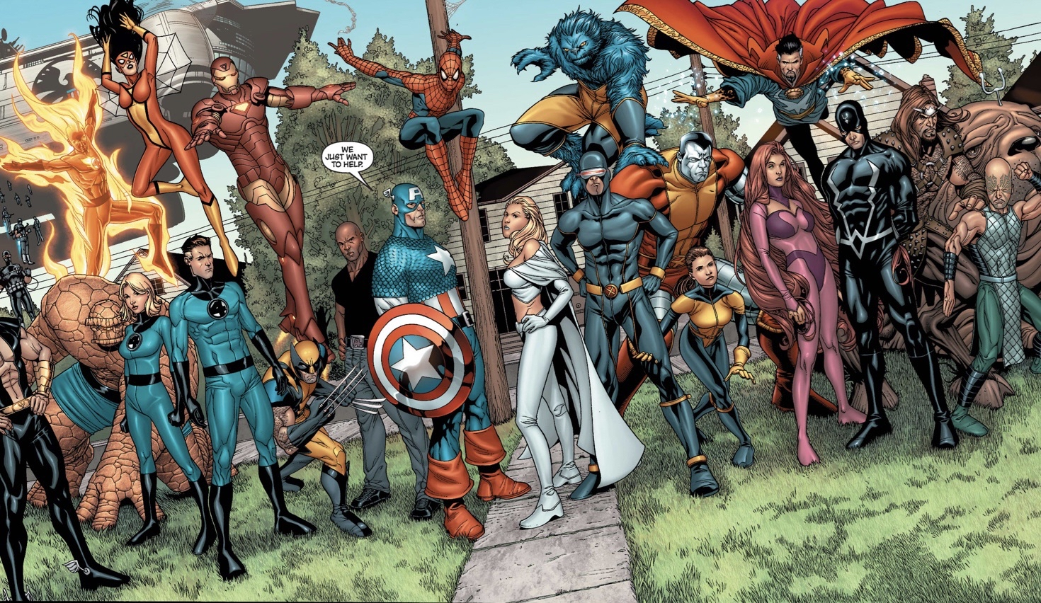 扉が開いた瞬間、そこに待っていたのはアベンジャーズ、X-MEN、ファンタスティック・フォー、インヒューマンズ、ドクター・ストレンジやSHELDの面々でした。(セントリーが光に包まれた後にどこ行ったのかわからないのですが、玄関前にいるのでたぶんレイノルズの家に瞬間移動したと思ってます)
